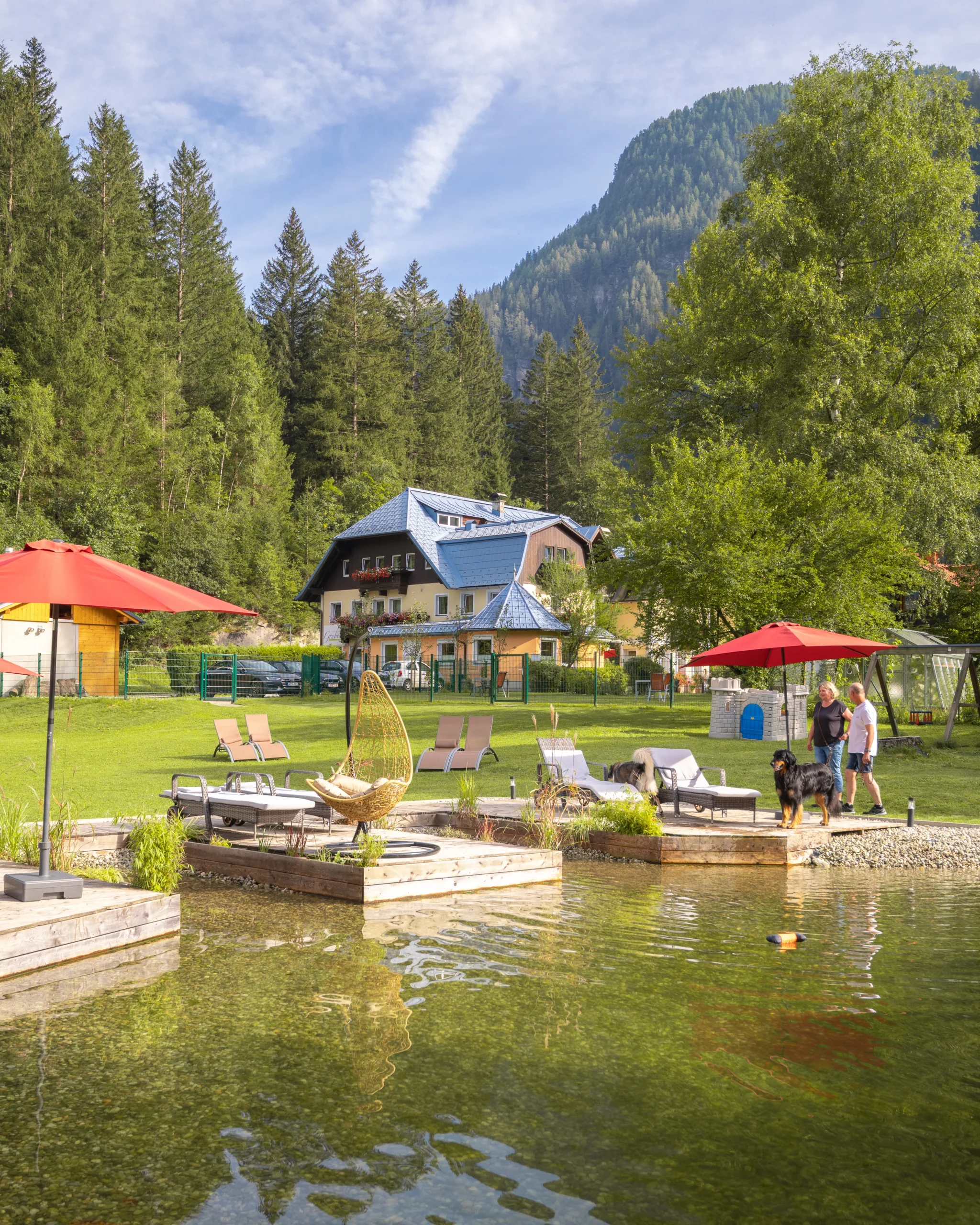 Im großen Garten des GRUBERS wartet ein echtes Highlight: der wohl schönste Hundebadeteich der Alpen. Kristallklares Wasser, eine sichere Umzäunung und viel Platz zum Toben machen ihn zum Paradies für Vierbeiner – mit eigenem Steg zum Baden und Sonnenliegen für die Zweibeiner.