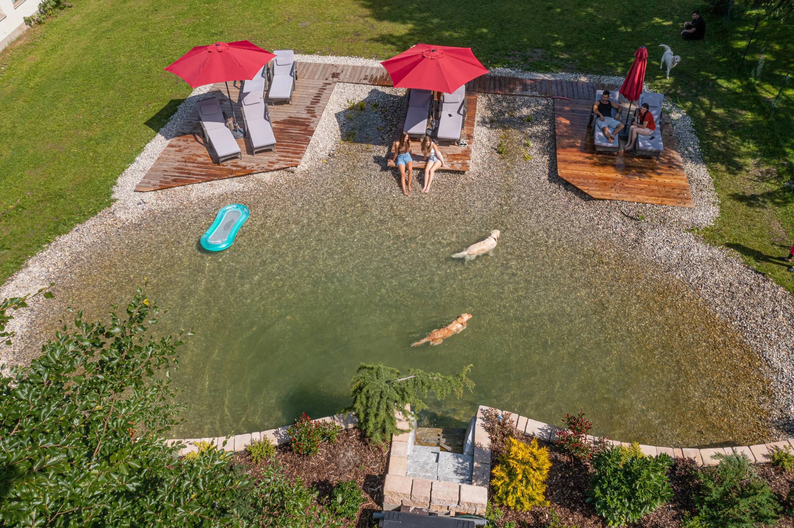 Bio-Naturbadeteich mit drei separaten Stegen zum Schwimmen, Relaxen & Sonnen